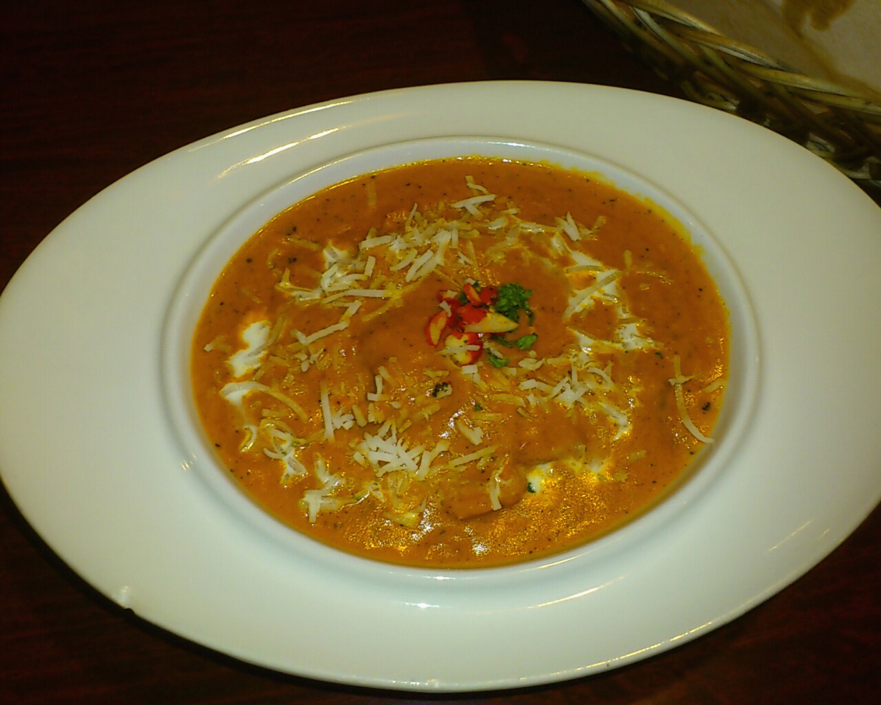 トマト、カシューナッツをベースにしたチキンティッカ入りレッドカレー。