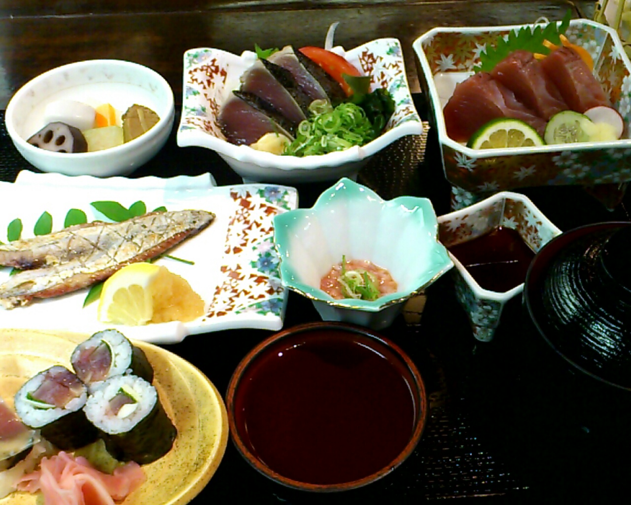 刺身、たたき、鰹の天ぷら、ハランボの塩焼きなど、本当に鰹づくし。